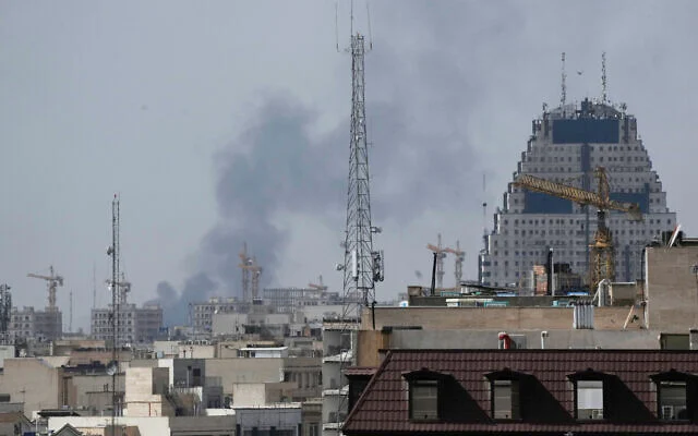 Smoke rises on the skyline after an explosion in Tehran, Iran, February 28, 2026. (AP Photo/Vahid Salemi)
