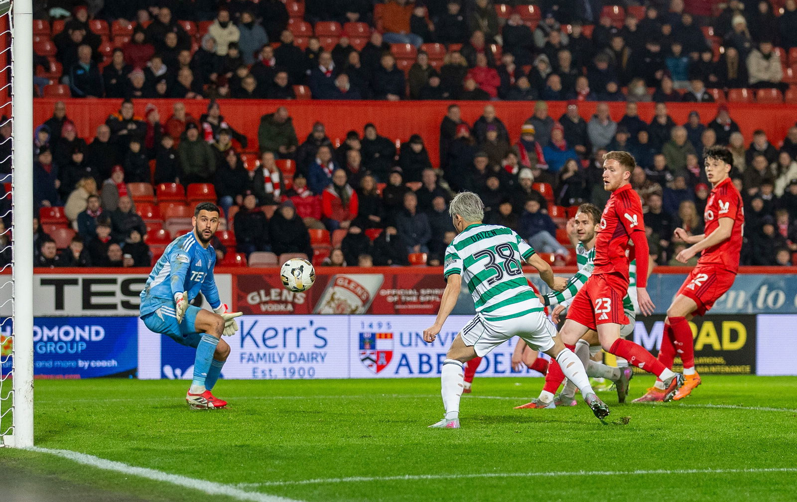 4th March 2026; Pittodrie Stadium, Aberdeen, Scotland; Scottish Premiership Football, Aberdeen versus Celtic; Benjamin Nygren of Celtic shoots and scores in the 67th minute to make it 2-1 to Celtic