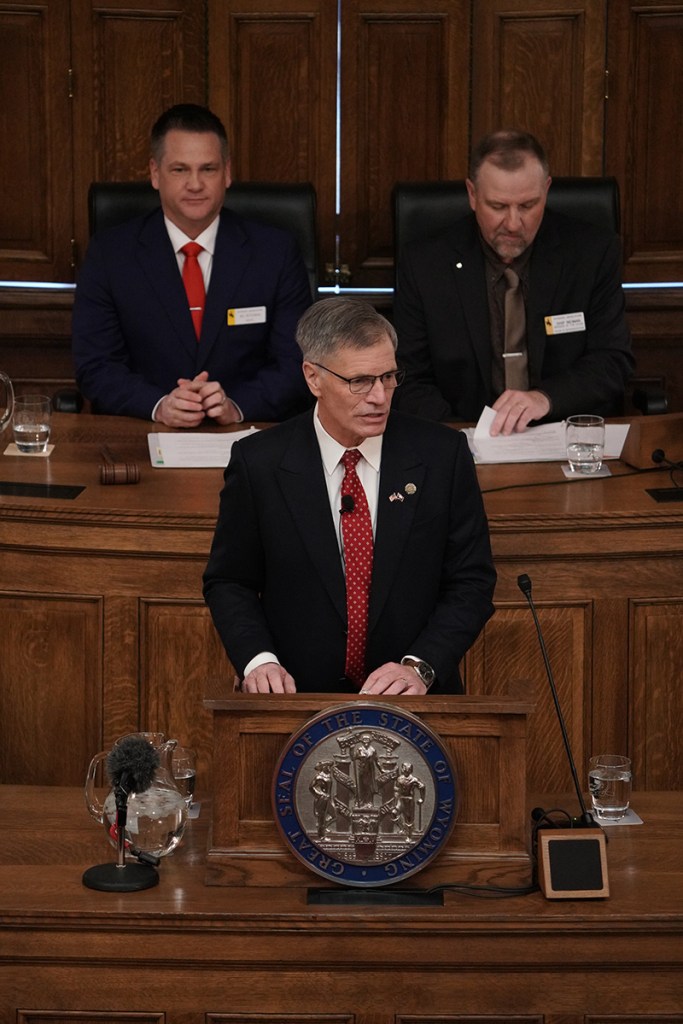 Gov. Mark Gordon addresses lawmakers Monday, Feb. 9, 2026, during his State of the State address at the Capitol in Cheyenne. (Mike Vanata/WyoFile)