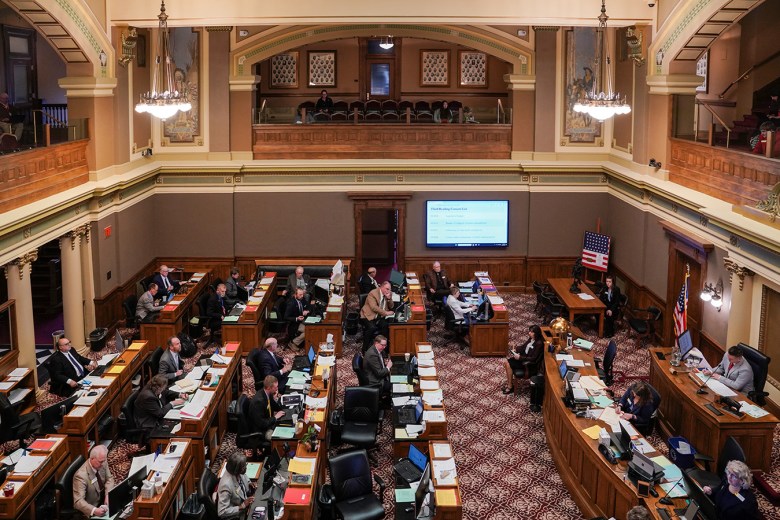 State senators work from the Senate Chamber during the 2026 Wyoming Legislature budget session in Cheyenne. (Mike Vanata/WyoFile)