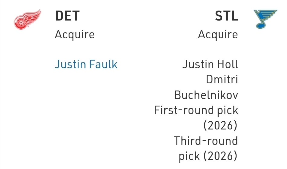 St. Louis managed to keep all its best assets (Thomas, Kyrou, and Parayko) and got back multiple firsts, thirds and prospects, which is a win. And for the Red Wings, hey, they get better, Faulk fits a clear need they had, and should help their forwards get to play on offence more, given how well he sees the ice.
