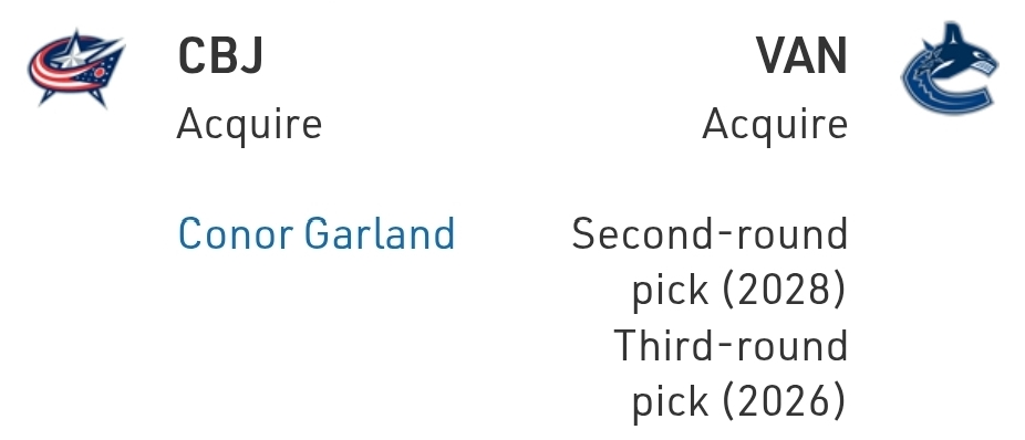 I like this for the Blue Jackets, who have some trouble attracting talent, but get a guy who fits their underdog identity. Conor Garland competes like hell, is smart, and should help them stay in the playoff fight. Meanwhile, the Canucks are wisely just accruing picks.