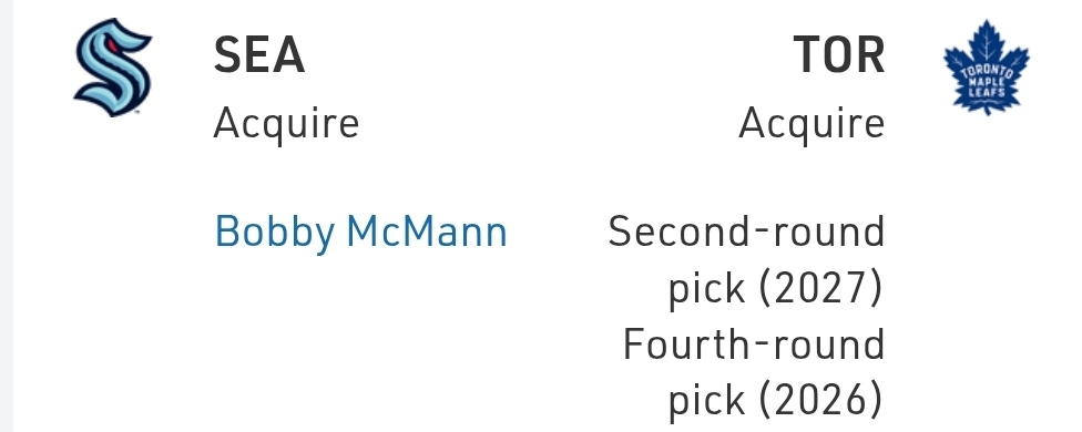 I like this pick-up for Seattle, Bobby McMann is a great guy to have down the lineup as he won’t drive play but he can take a quiet moment and turn it loud with a burst of speed or a ripped shot. The Leafs were asset hunting and this is something like what they thought they’d get. Both teams are likely happy here.