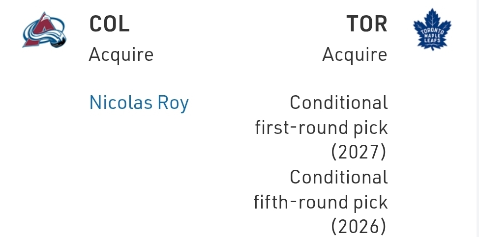 For the Avalanche, Nicolas Roy does a lot of things for them, including is very cheap, is experienced, is big, he can play centre, and he’s won a Cup. He also makes smart little plays and is low maintenance. So, while he’s not a sexy acquisition, I get it. And for the Leafs, that kind of return is a no-brainer.