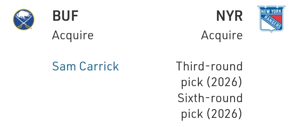 Buffalo clearly looked at itself in the mirror and didn’t see a team with the sandpaper to hang in the playoffs. And while it probably doesn’t hate giving up those picks, it feels a touch expensive for Sam Carrick (particularly when Scott Laughton went for less).