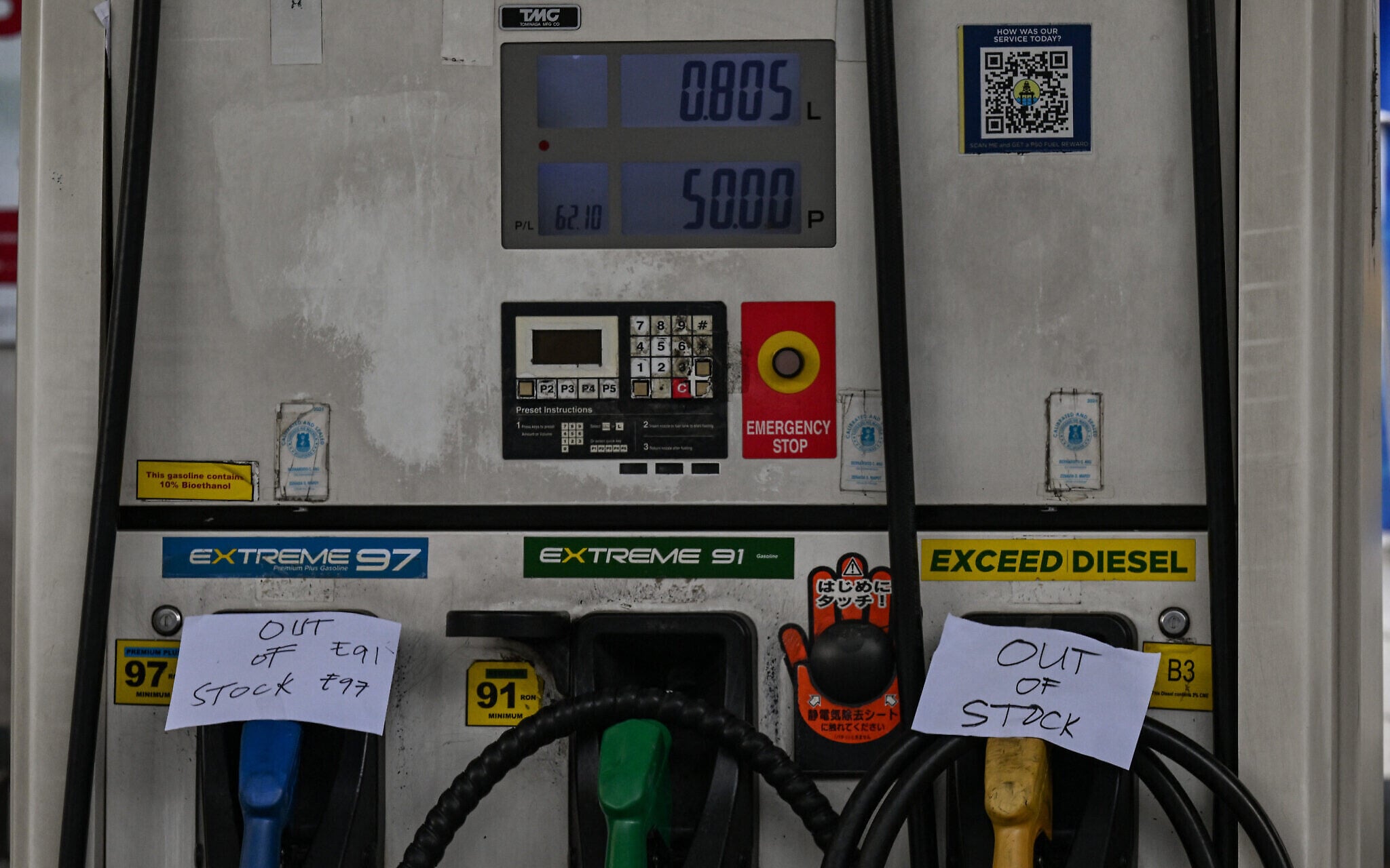 Signs reading ‘out of stock’ are displayed at a gas station amid rising petrol prices in Manila on March 9, 2026 (Jam STA ROSA / AFP)