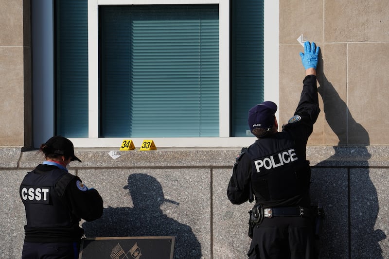 U.S. Consulate shooting in Toronto Forensic Toronto police officer marks a bullet impact mark at the U.S. consulate in Toronto on Tuesday March 10, 2026. (Frank Gunn/ The Canadian Press)