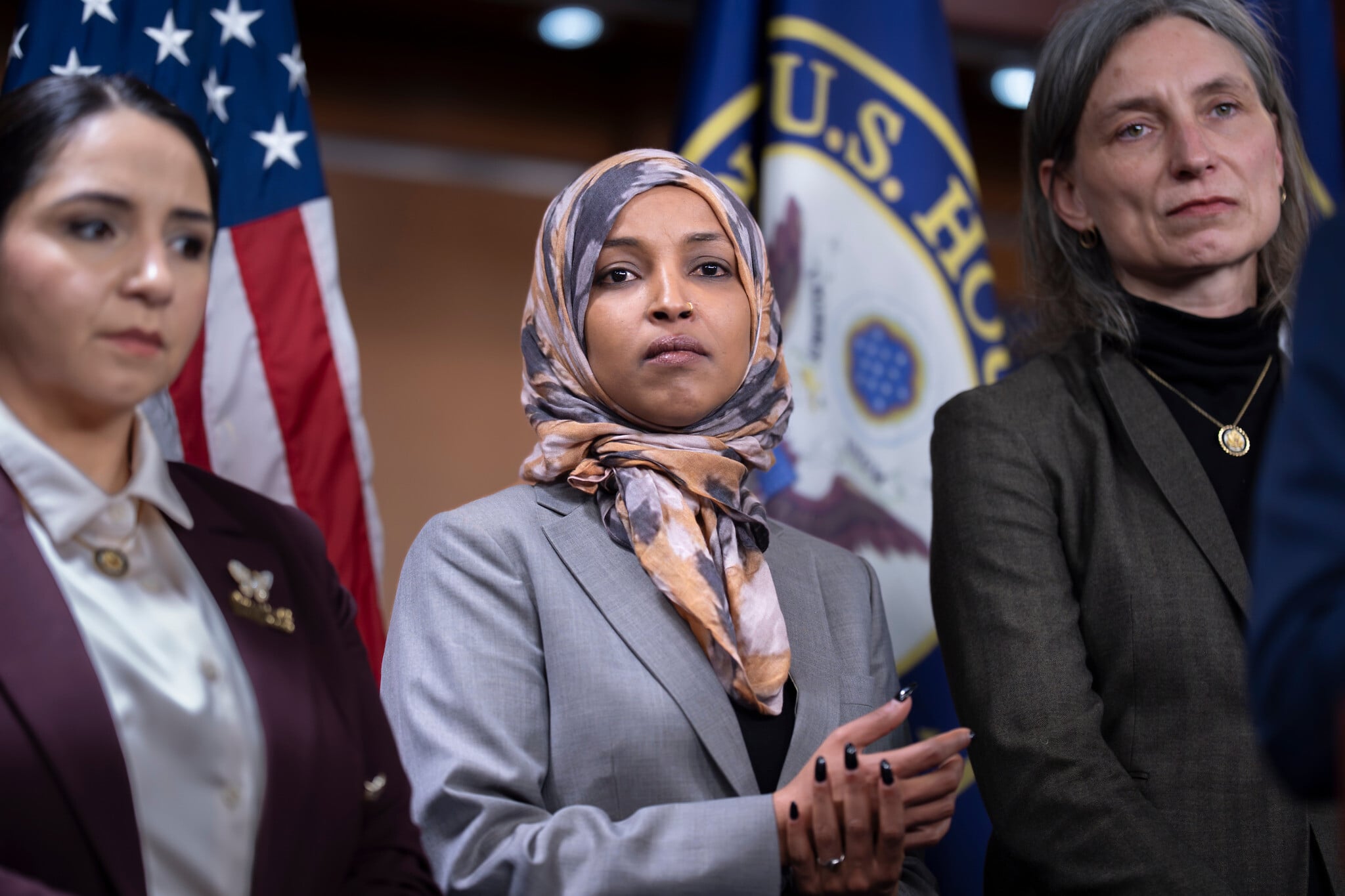 From left, Rep. Delia Ramirez, Rep. Ilhan Omar, and Rep. Maxine Dexter at a news conference at the US Capitol in Washington, January 13, 2026. (AP Photo/J. Scott Applewhite)