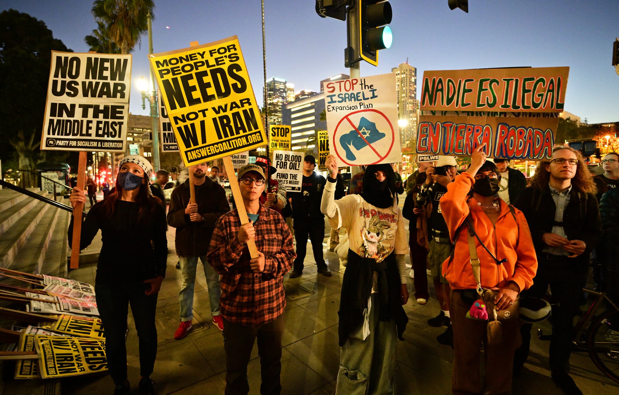 Demonstrators hold placards as they rally during a protest against military action in Iran outside of City Hall in Los Angeles, California, on March 2, 2026. (Frederic J. BROWN / AFP)