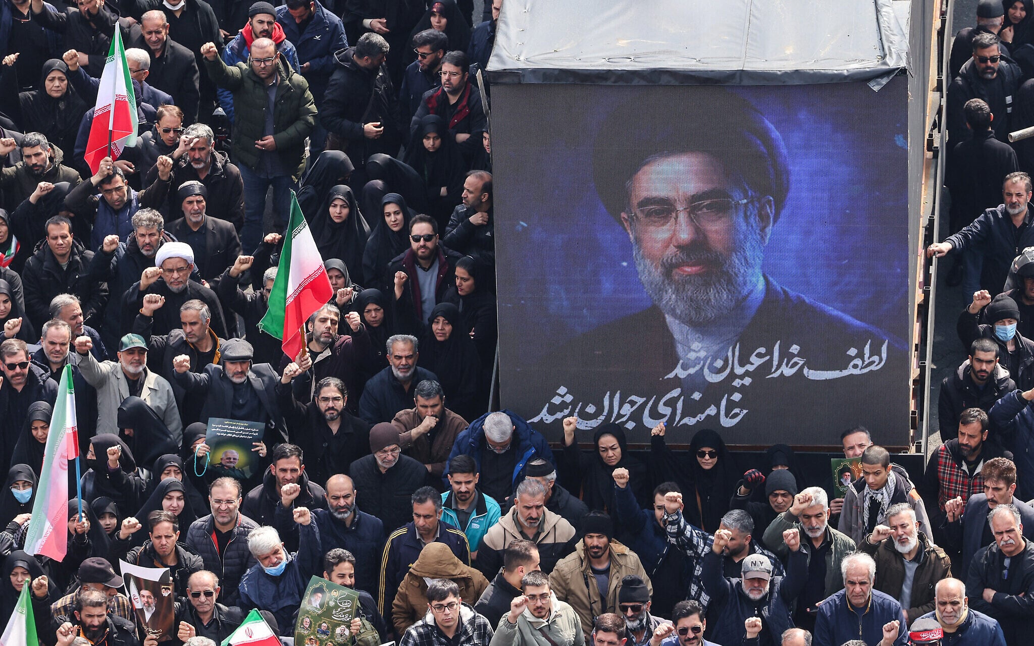 A screen displays a portrait of Iran’s new supreme leader Mojtaba Khamenei, during the funerals of Islamic Revolutionary Guards Corps commanders, army commanders and others killed in the early days of the US and Israeli strikes on Iran, at Enghelab Square in Tehran on March 11, 2026. (Atta Kenare/AFP)