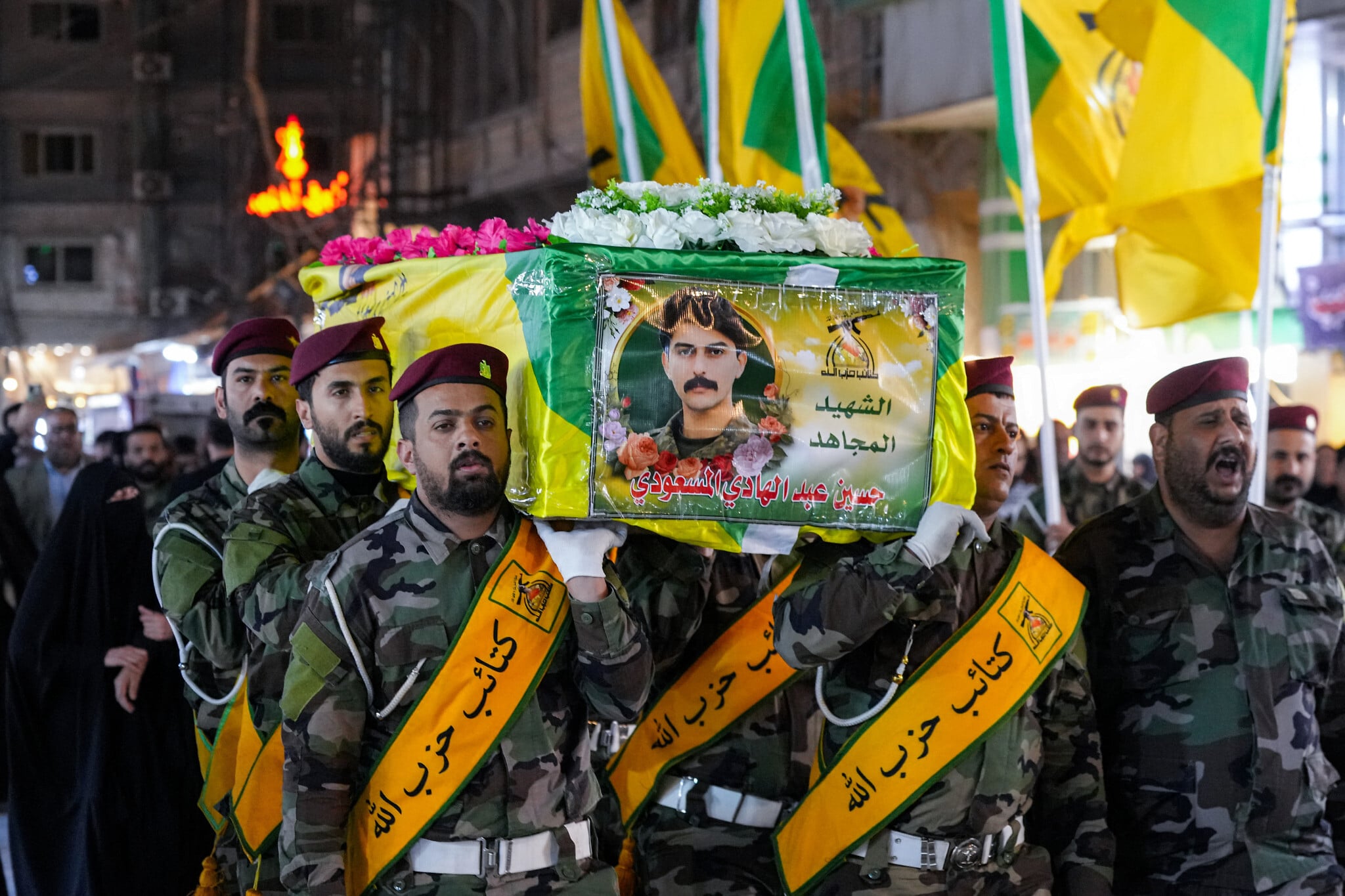 Illustrative: Iraq’s pro-Iran Kataeb Hezbollah group, which joined the fighting amid the US-Israeli war Iran, holds a funeral at the shrine of Imam Ali in Iraq’s central holy city of Najaf on March 14, 2026. (Qassem al-KAABI / AFP)