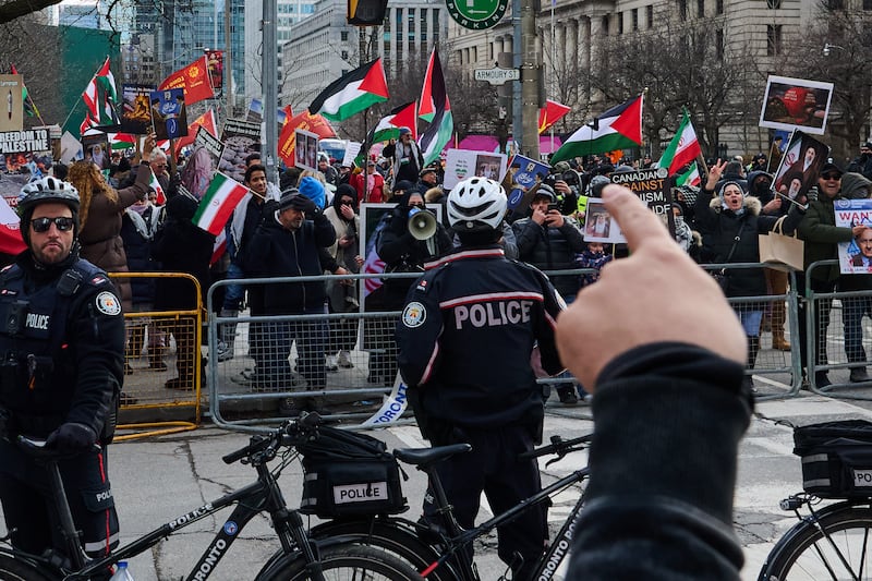 TPS Police stand by as protesters and counter-protesters demonstrate by the U.S. Consulate during a rally for Al-Quds Day, in Toronto, on Saturday, March 14, 2026. THE CANADIAN PRESS/Sammy Kogan