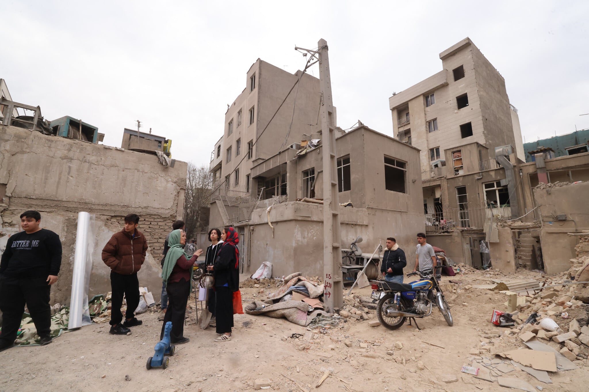 Iranians gather in front of destroyed buildings following a military strike on the Iranian capital Tehran on March 15, 2026. (Atta KENARE / AFP) /