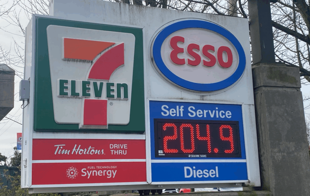 Gas reaches 204.9 at a station near Guildford in Surrey. (Ryan Lidemark /1130 NewsRadio Image)