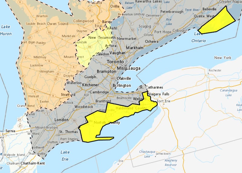 A yellow warning for wind is also in effect for Niagara Falls – Welland – Southern Niagara Region and areas near Lake Erie.