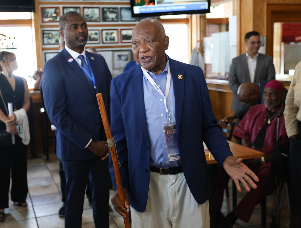 U.S. Rep. Danny Davis speaks during a fundraising luncheon at the Billy Goat Tavern near the United Center on day two of the Democratic National Convention in Chicago on Tuesday, Aug. 20, 2024. State Rep. La Shawn Ford stands behind Davis. Credit: Talia Sprague/Block Club Chicago