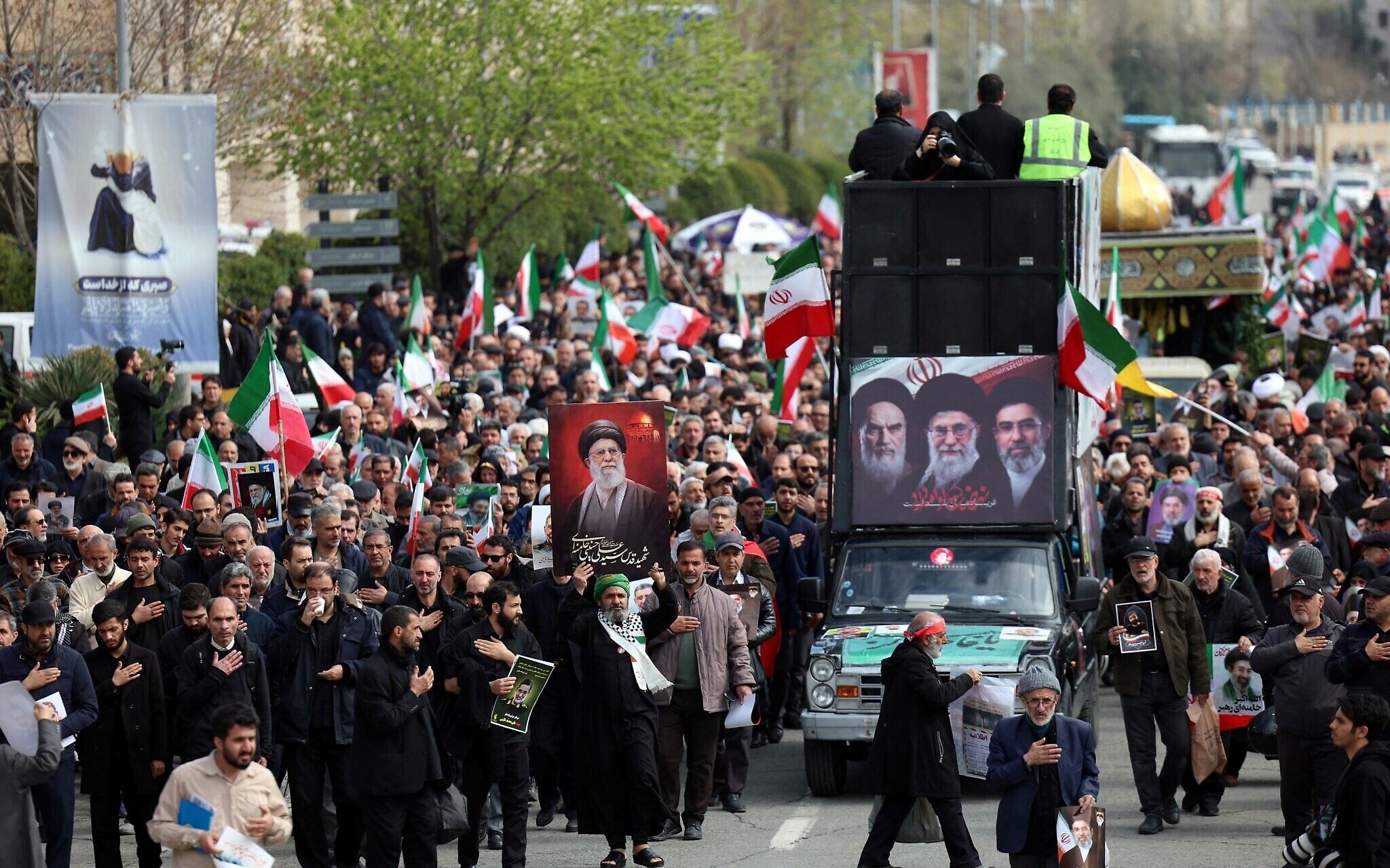 A hearse decorated with pictures of (L-R) Iranian spiritual leader Ayatollah Ruhollah Khomeini, Iran’s slain supreme leader Ayatollah Ali Khamenei and Iran’s new Supreme Leader Ayatollah Mojtaba Khamenei drives past Iranians attending the funeral ceremony of Iran’s Revolutionary Guards spokesperson Gen. Ali Mohammad Naeini, who was killed in US-Israeli strikes, in Tehran on March 21, 2026. (AFP)