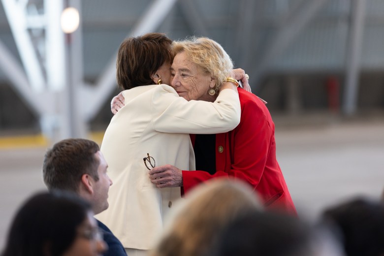 U.S. Rep. Zoe Lofgren, right, hugs former U.S. Rep. Anna Eshoo, left, during an event celebrating the completed renovation of Hangar One at Moffett Field in Mountain View on March 20. Photo by Magali Gauthier.
