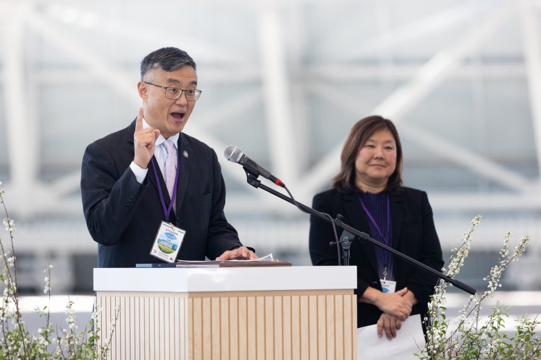 Santa Clara County Supervisor Otto Lee speaks to attendees during an event celebrating the completed renovation of Hangar One at Moffett Field in Mountain View on March 20. Photo by Magali Gauthier.