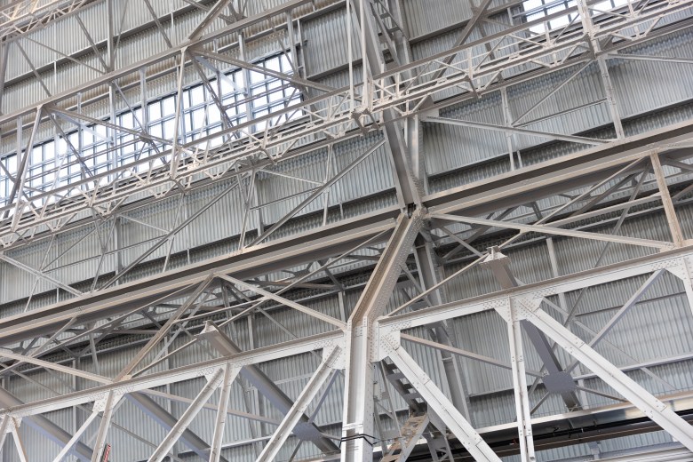 To remove the toxic chemicals, Planetary Ventures surrounded the hangar with scaffolding and worked section by section, cleaning about 1.8 million square feet of steel elements. The steel frame was then primed and repainted while siding, doors and windows were later added.