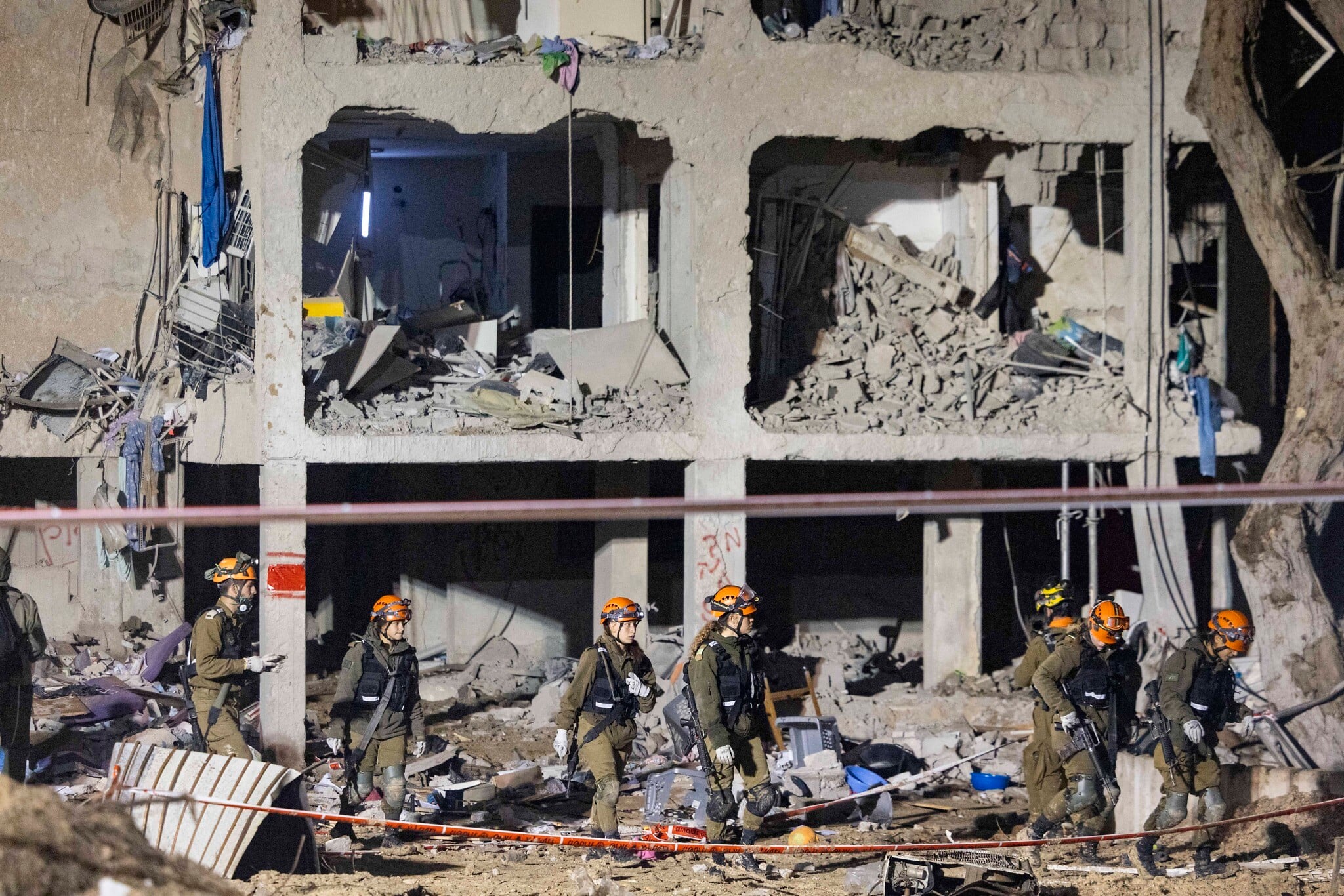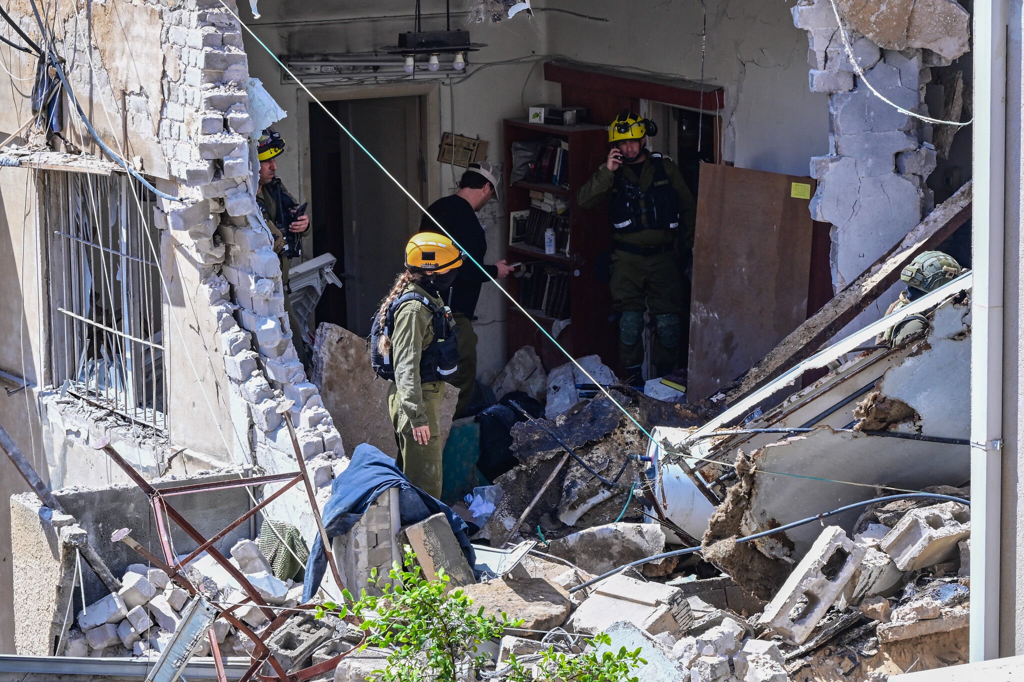 Israeli security and rescue forces at the scene where a missile fired from Iran toward Israel caused damage to residential buildings in the southern Israeli city of Arad, March 22, 2026. (Chaim Goldberg/Flash90).
