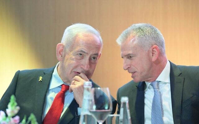 Prime Minister Benjamin Netanyahu, left, and Mossad Director David Barnea at the Prime Minister’s Award ceremony in Jerusalem, September 17, 2025. (Amos Ben Gershom/GPO)