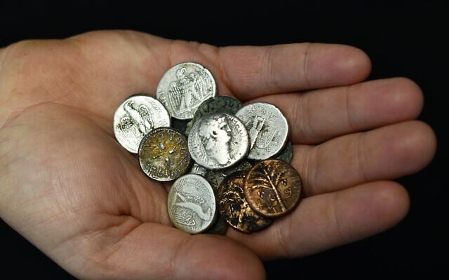 Dozens of rare ancient coins dating back about 2,000 years, suspected of having been looted, were seized during an inspection at the Hizma Checkpoint north of Jerusalem in the West Bank on February 20, 2026. (Yoli Schwartz/Israel Antiquities Authority)