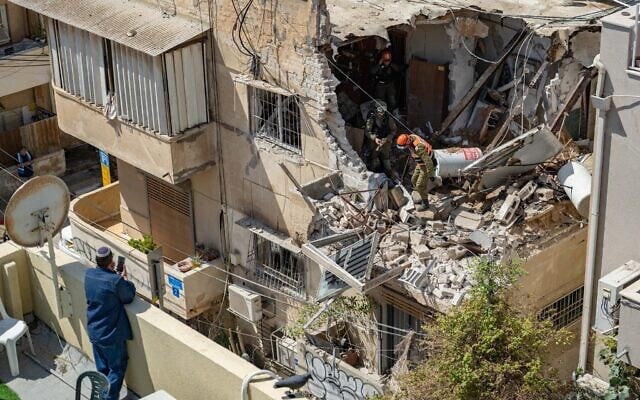 Israeli security and rescue forces at the scene where a missile fired from Iran at Israel caused damage in Tel Aviv, March 22, 2026. (Flash90)