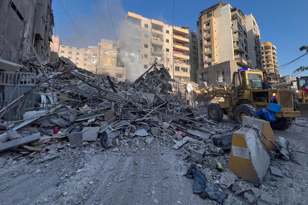 A bulldozer removes the rubbles of a destroyed building that was hit by an Israeli airstrike in Dahiyeh, Beirut’s southern suburbs, Lebanon, Tuesday, March 24, 2026. (AP Photo/Hussein Malla)
