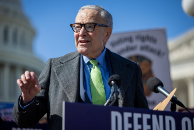 Schumer speaks during a rally against the SAVE America Act outside the U.S. Capitol on March 18. Photo by Nathan Posner/Anadolu via Getty Images.