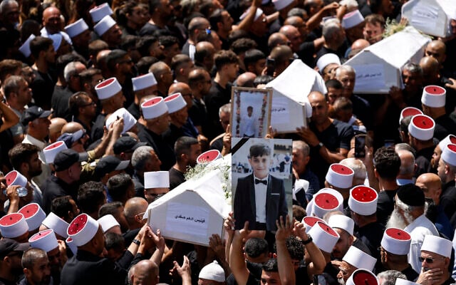 Mourners carry the coffins of 10 of the 12 children killed in a Hezbollah rocket attack in Majdal Shams on July 28, 2024 on July 28, 2024 (Jalaa MAREY / AFP)