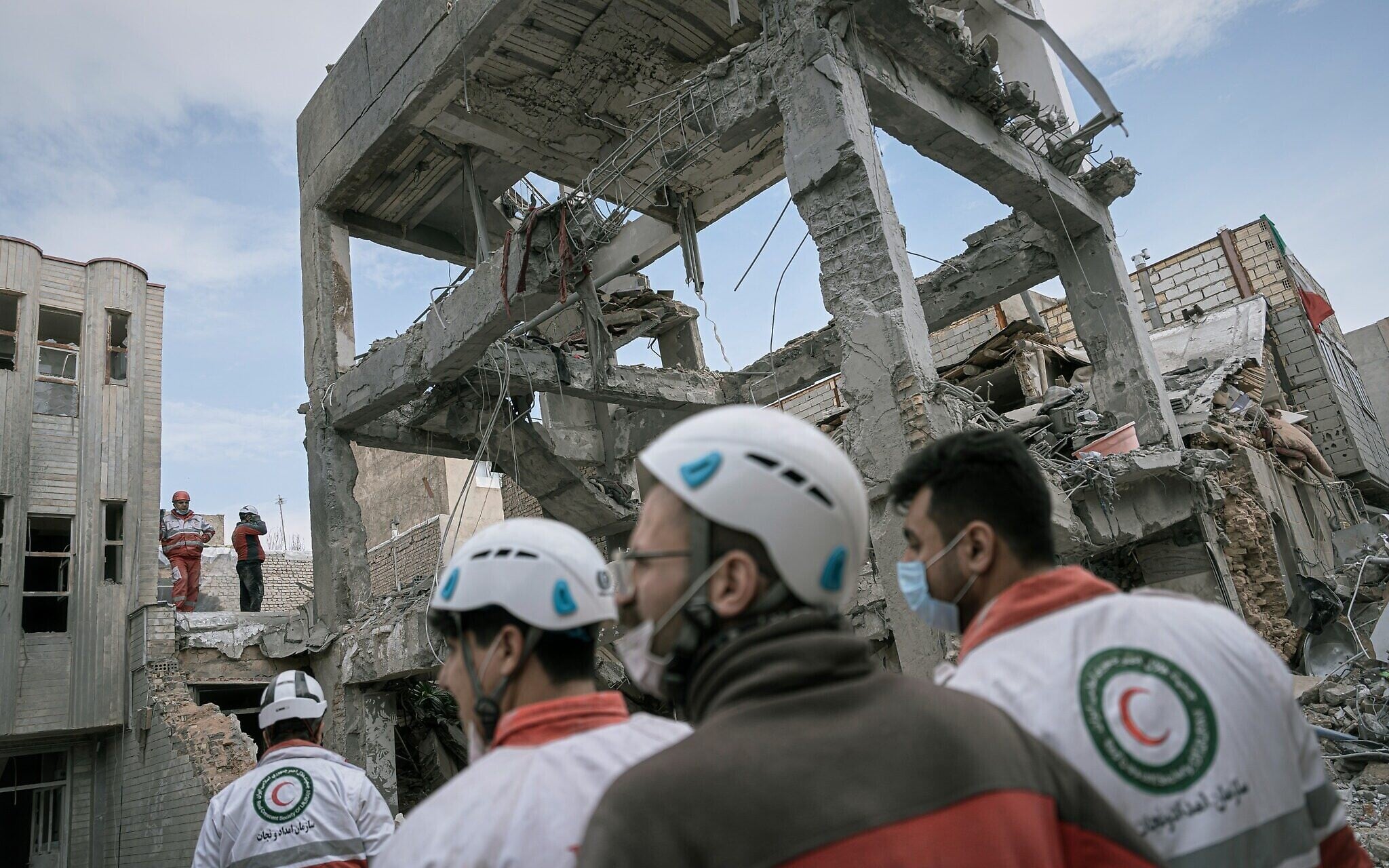 First responders inspect the remains of a residential building hit in an overnight strike during the US-Israeli military campaign, in Tabriz, East Azerbaijan Province, northwestern Iran, March 24, 2026. (AP Photo/Matin Hashemi)