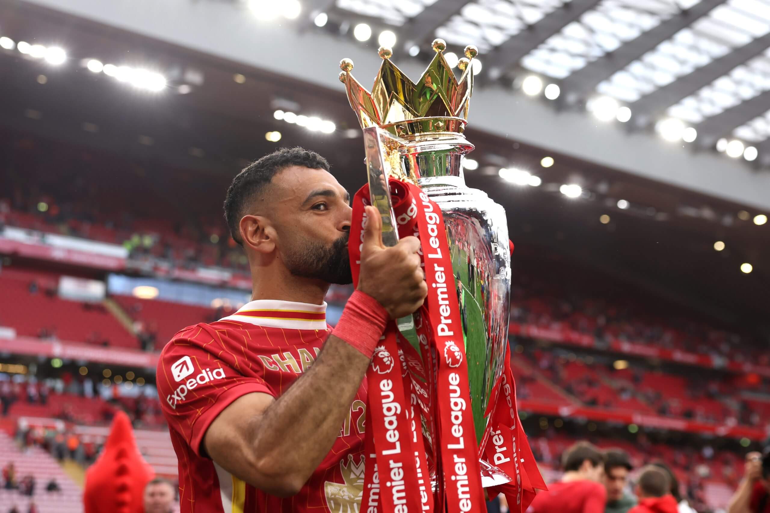 Salah with the Premier League trophy in May 2025 (Carl Recine/Getty Images)