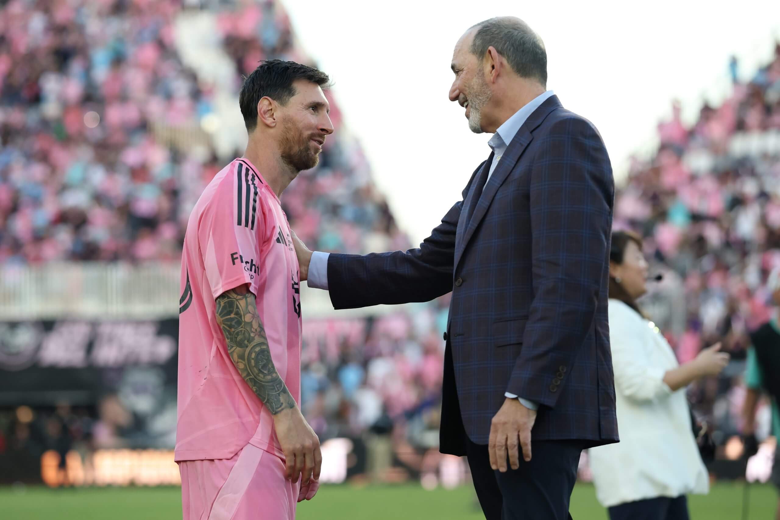 Don Garber, pictured with Lionel Messi, said in December that MLS would welcome Salah if he wanted to move to the U.S. (Elsa/Getty Images)
