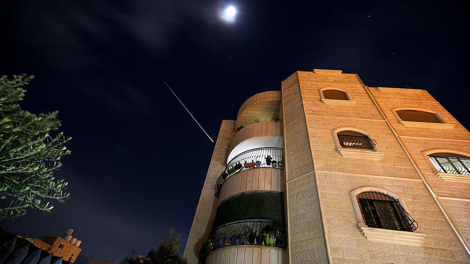 Missiles launched by Iran in retaliation for US and Israeli attacks streak across the sky over Hebron in West Bank, as Israeli air defense systems respond, on March 28, 2026. (Photo by Wisam Hashlamoun/Anadolu via Getty Images)
