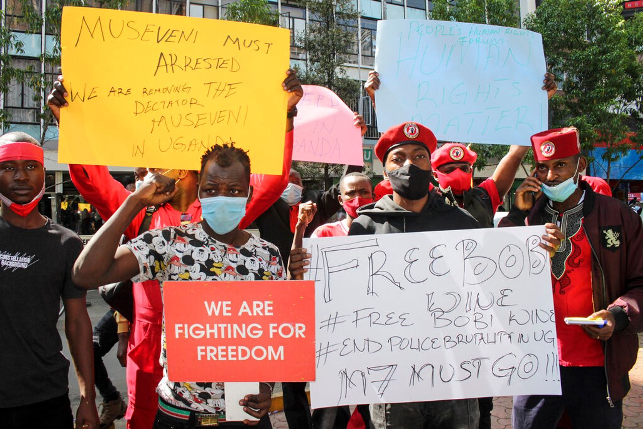 Ugandan supporters of opposition presidential candidate Bobi Wine protest his arrest and call for his release and an end to police brutality, outside the Ugandan High Commission in Nairobi, Kenya, November 19, 2020 [AP Photo/ AP Photo]