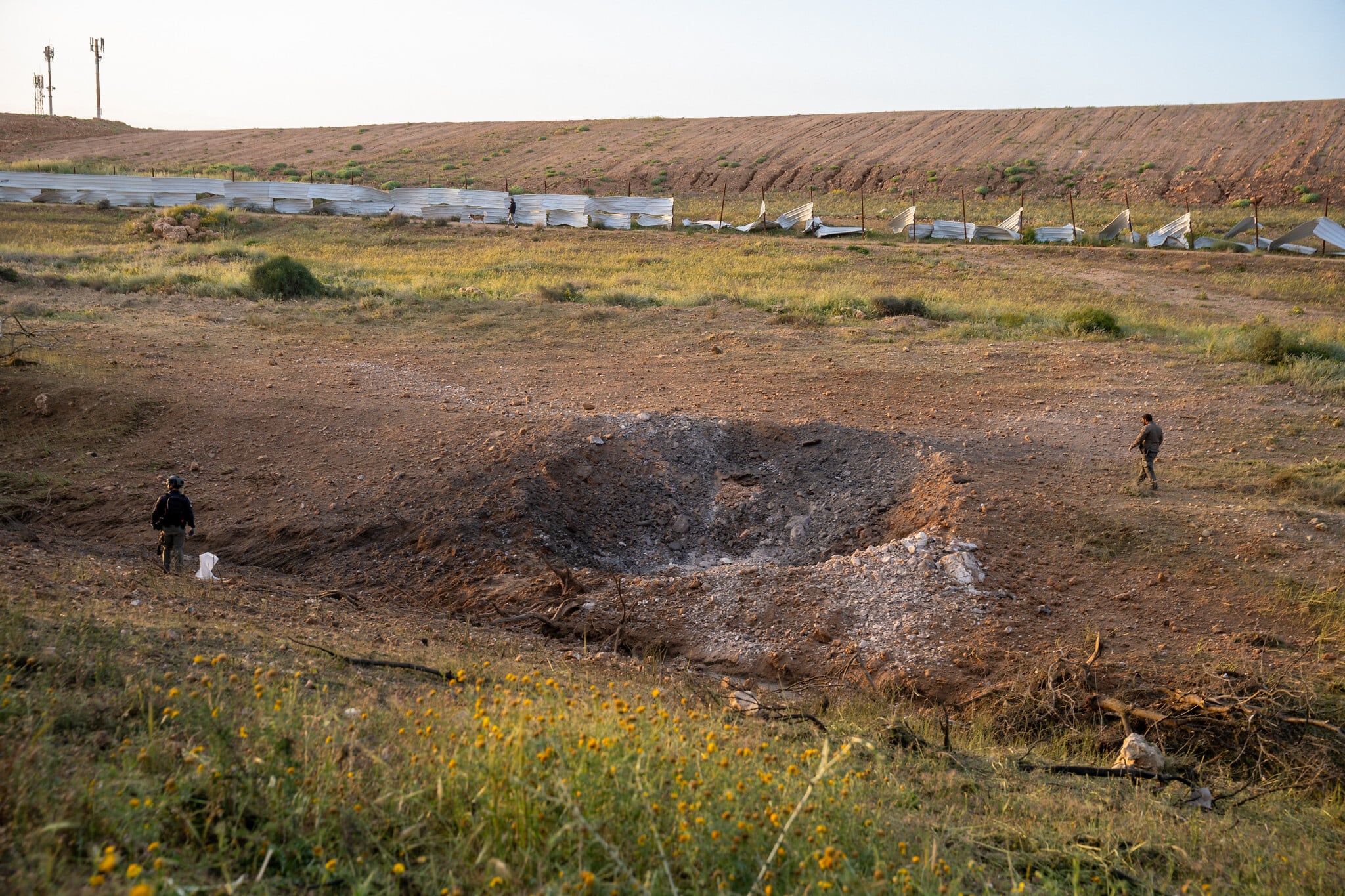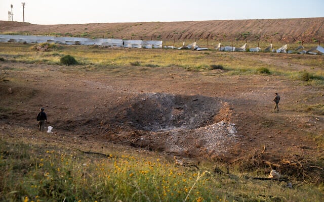 The site of an Iranian missile impact in an open area in Beersheba, March 29, 2026. (Emanuel Fabian/Times of Israel)