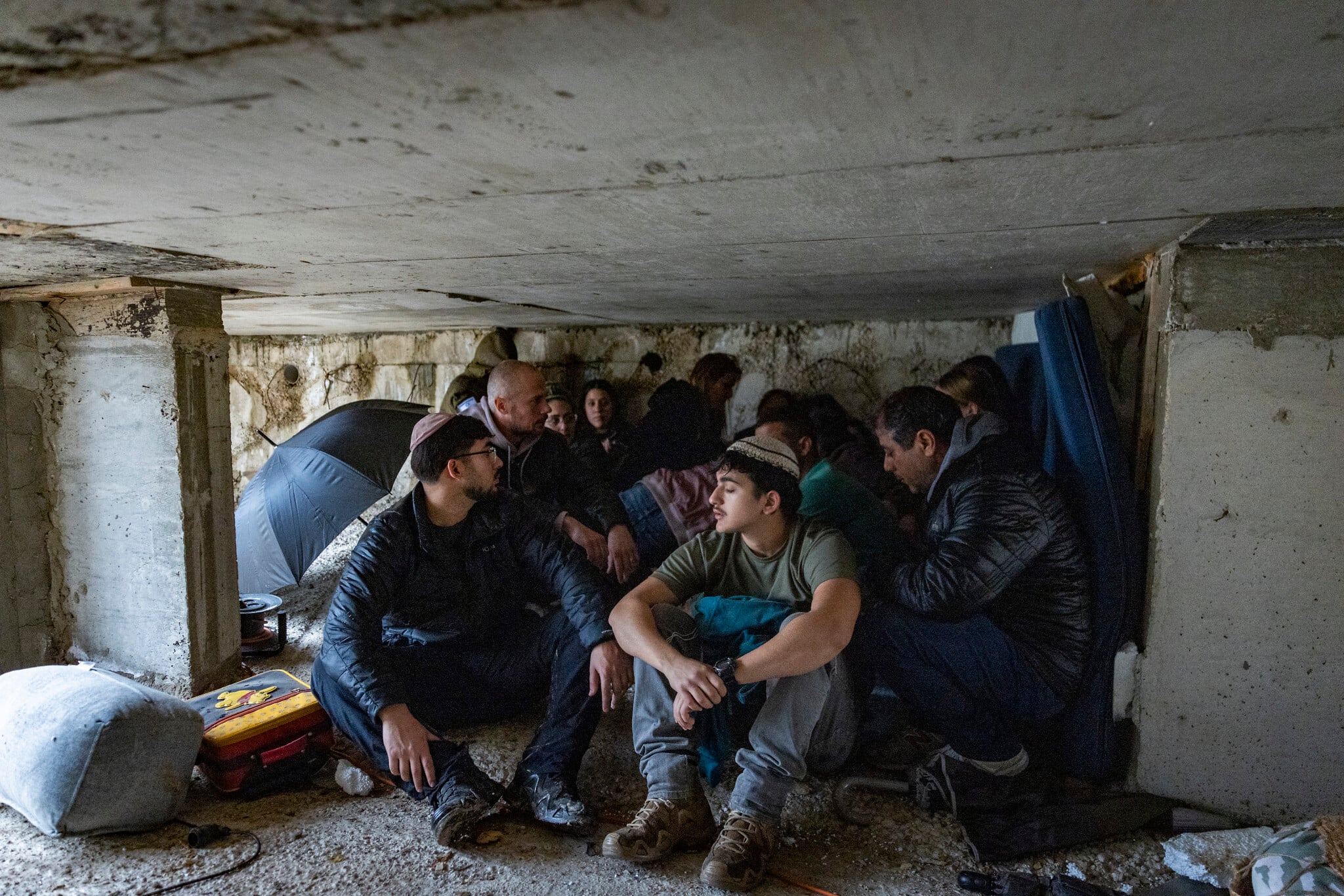 People take cover as a siren warns of incoming missiles near the city of Beit Shemesh, March 29, 2026. (Chaim Goldberg/Flash90)