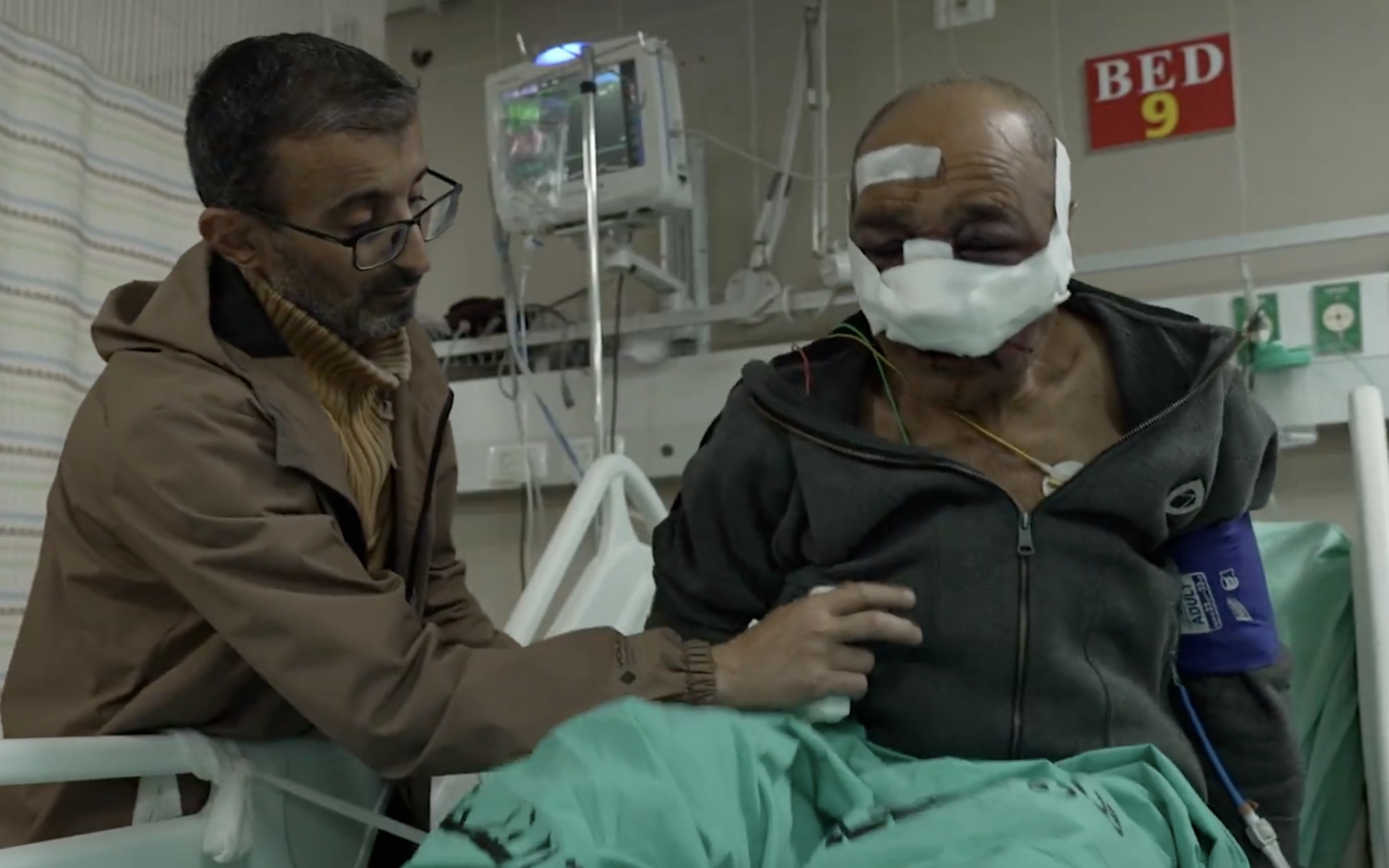 Abduallah Daraghmeh, right, sits bandaged in a hospital bed following a settler attack on the northern West Bank village of Tayasir on March 26, 2026. (Screen capture: CNN)