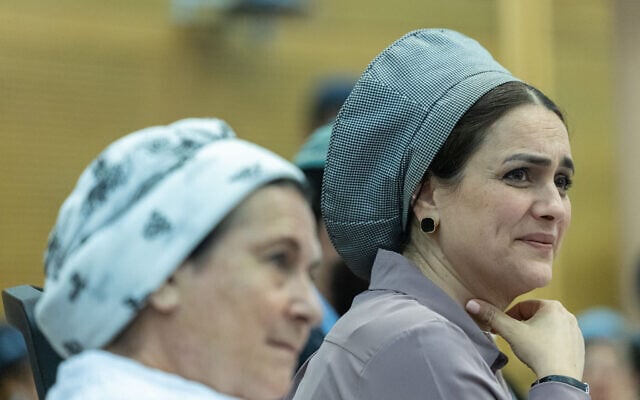 Limor Son Har-Melech (right) attends a meeting of the Knesset Lobby for the Renewal of Jewish Settlement in the Gaza Strip, held at the Knesset in Jerusalem, July 22, 2025. (Chaim Goldberg/Flash90)