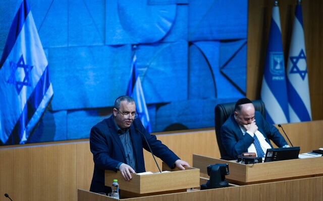 MK Gilad Kariv speaking before the Knesset, March 18, 2026. (Yonatan Sindel/Flash90)