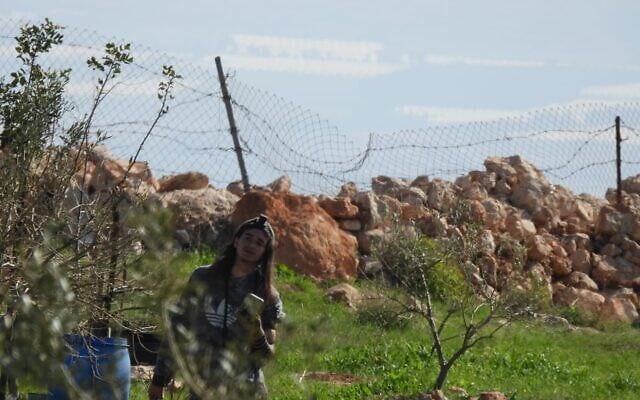 A West Bank settler putting on tefillin and praying while grazing his sheep among Bedouin compounds close to the Palestinian town of Duma, March 6, 2026. (Courtesy)