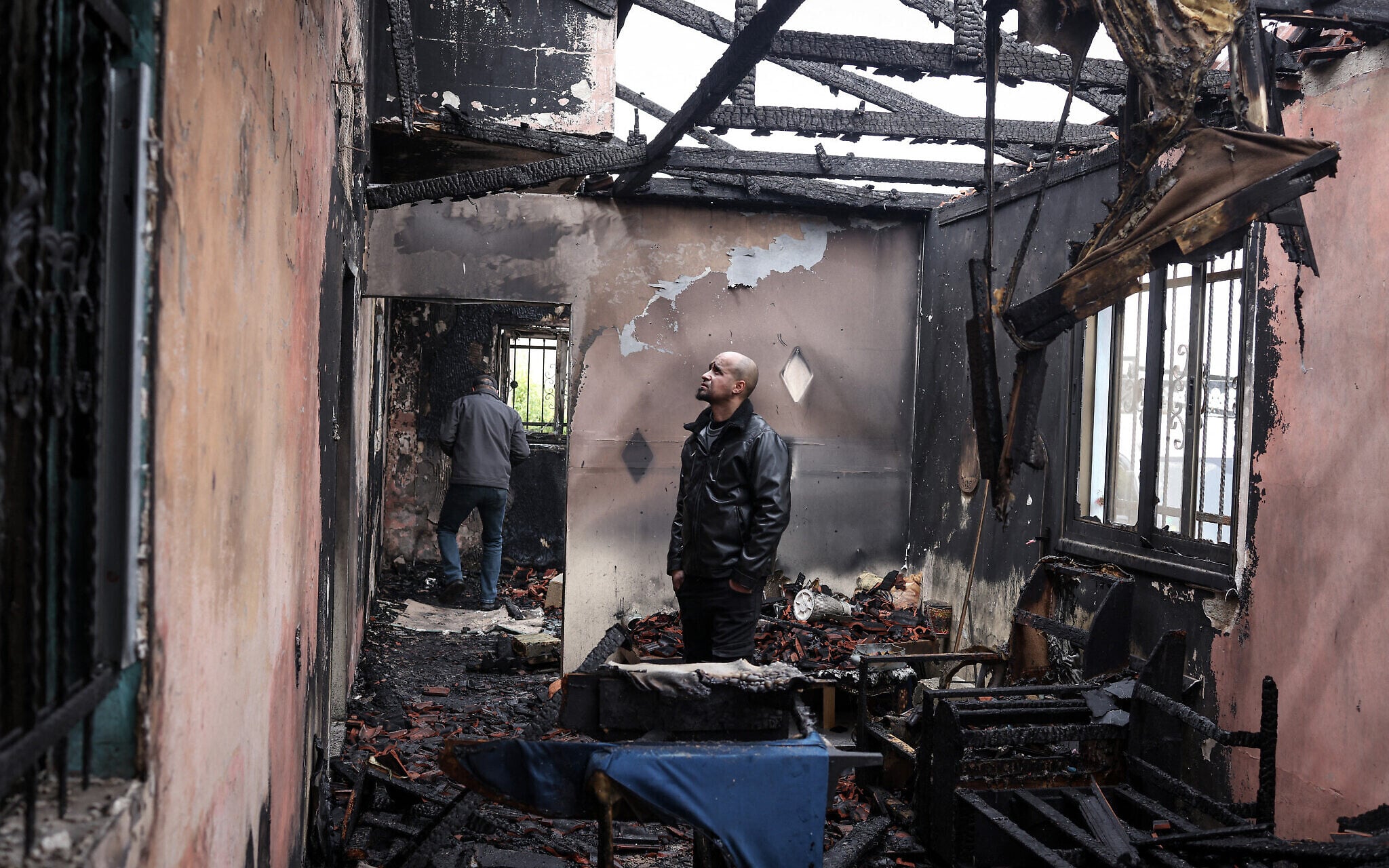 A Palestinian man inspects the remains of his burnt-out family home following a reported attack by extremist Israeli settlers in the village of Fandaqumiya, southwest of Jenin, in the West Bank on March 22, 2026. (Zain JAAFAR / AFP)