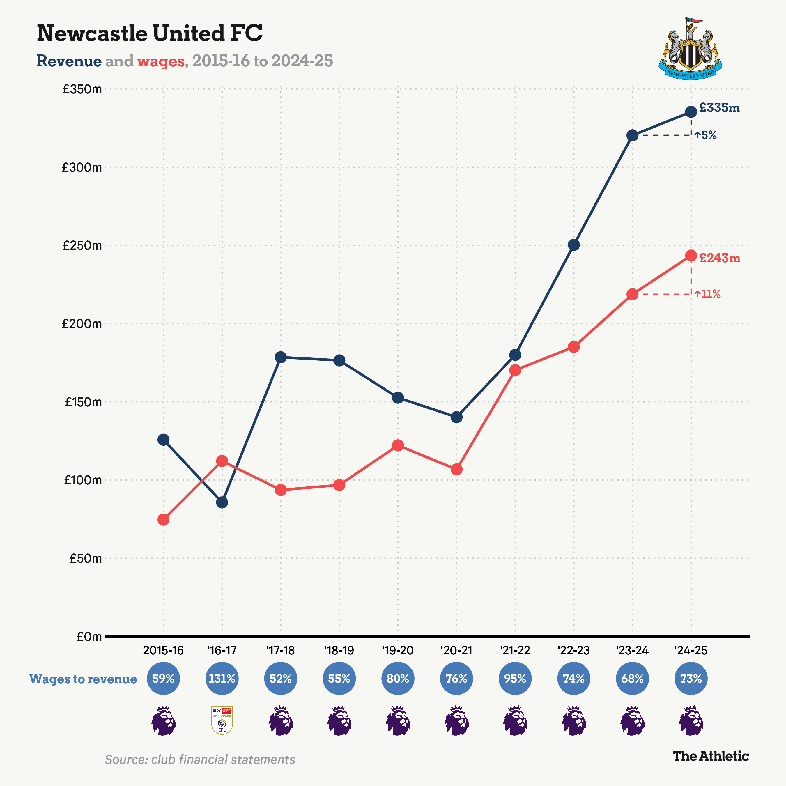 Each of those clubs also exceeded the 70 per cent squad-cost limit in 2024 and, while it is harder to discern, Newcastle’s position there looks precarious too. The club’s wages-to-revenue metric rose from 68 to 73 per cent in 2024-25, though SCR is assessed over a calendar year. Newcastle’s 2025 position is enhanced by playing in the Champions League this season, but if they have breached SCR for 2025, a fine may await.