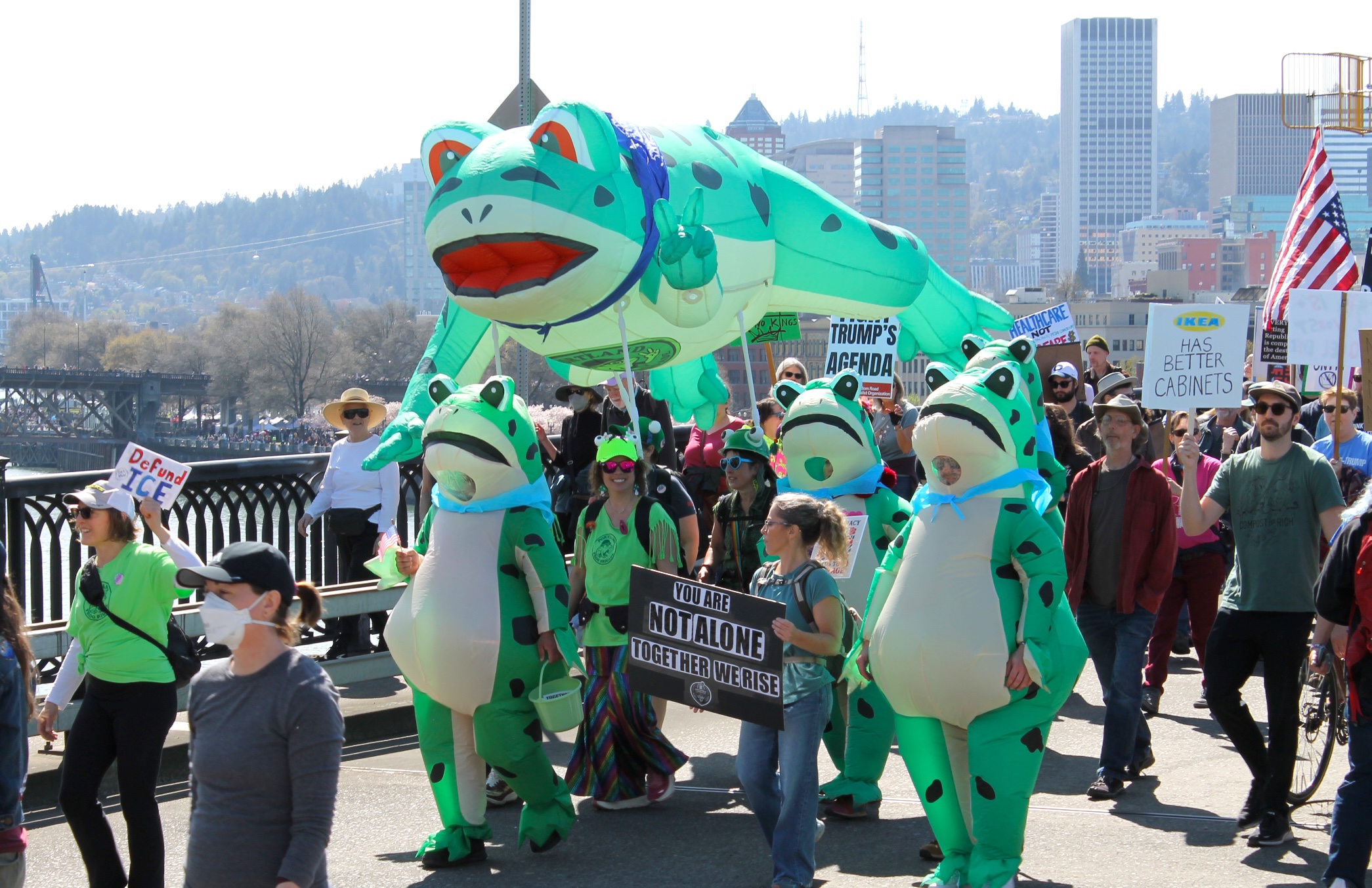But Maria’s worries about the turnout were ultimately for nothing. By noon, as people marched from other neighborhoods to the downtown waterfront, crowds thronged the riverbanks where the cherry trees were in full bloom. The Burnside Bridge was packed with people; just north, over the sparkling water of the Willamette River, the Steel Bridge was also thick with Portlanders chanting and carrying signs. Crowds waited patiently on the banks to march the two-mile route that crossed from the west side of the city to the east and back again. An estimated 30,000 people turned out on the streets of downtown Portland. Organizers estimated that 8 million people protested nationwide.