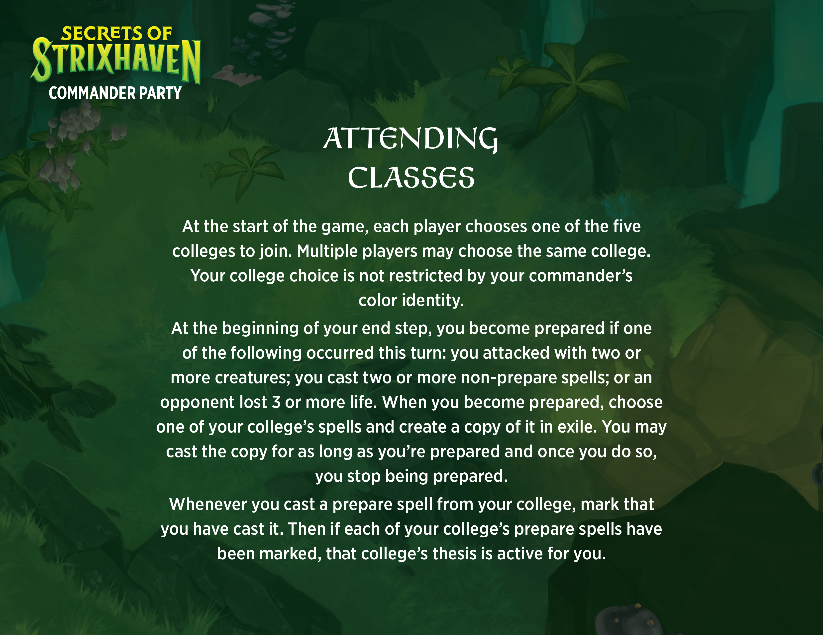 There’s a party on campus, and you’re invited! Secrets of Strixhaven’s Commander Party events add an additional layer of academic adventure to your games. At the start of the event, you’ll select one of Strixhaven’s colleges. By completing various tasks, you’ll be able to prepare one of your college’s spells and cast it during the game. Get ready to cast some especially powerful (and exciting) spells from across the Multiverse.