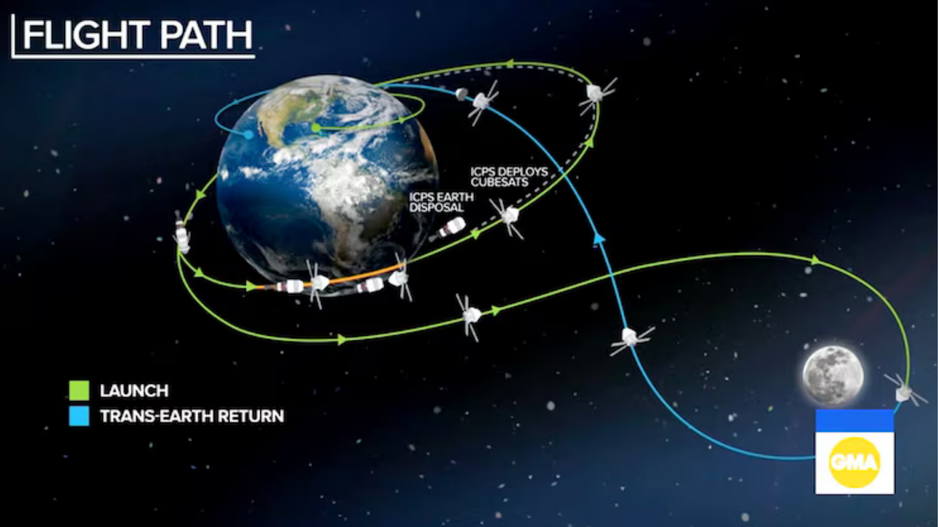 An hour into the flight, the upper stage boosted the Orion capsule, Integrity, and its crew into a higher orbit around Earth.
