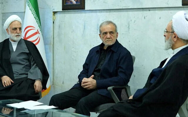 Iranian President Masoud Pezeshkian, Gholam-Hossein Mohseni-Eje’i, the head of the judiciary and Alireza Arafi, deputy chairman of the Assembly of Experts, attend the meeting of the interim leadership council of Iran in an unknown location, March 1, 2026. (Handout via IRIB/WANA)