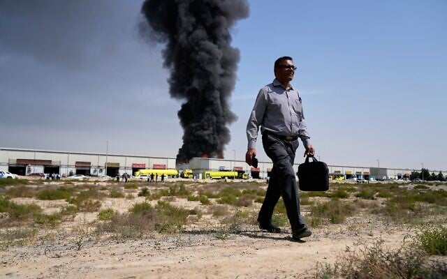 A man walks away after watching as a black plume of smoke rises from a warehouse in the industrial area of Sharjah City, United Arab Emirates, after an Iranian strike, March 1, 2026. (AP Photo/Altaf Qadri)