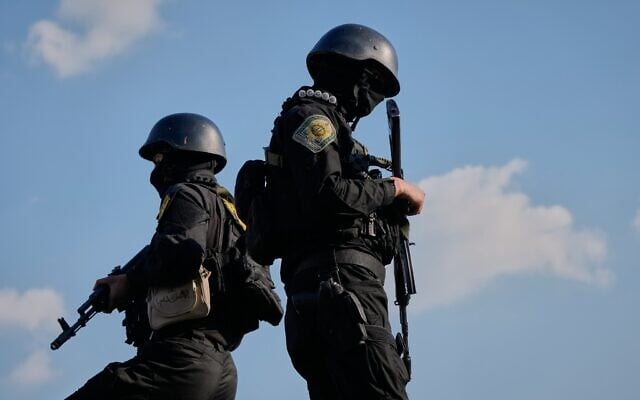 Iranian police special forces stand guard during a funeral procession for Alireza Tangsiri, head of Iran’s Islamic Revolutionary Guard Corps Navy, and others killed in Israeli strikes in late March, in Tehran, Iran, April 1, 2026. (AP Photo/Vahid Salemi)